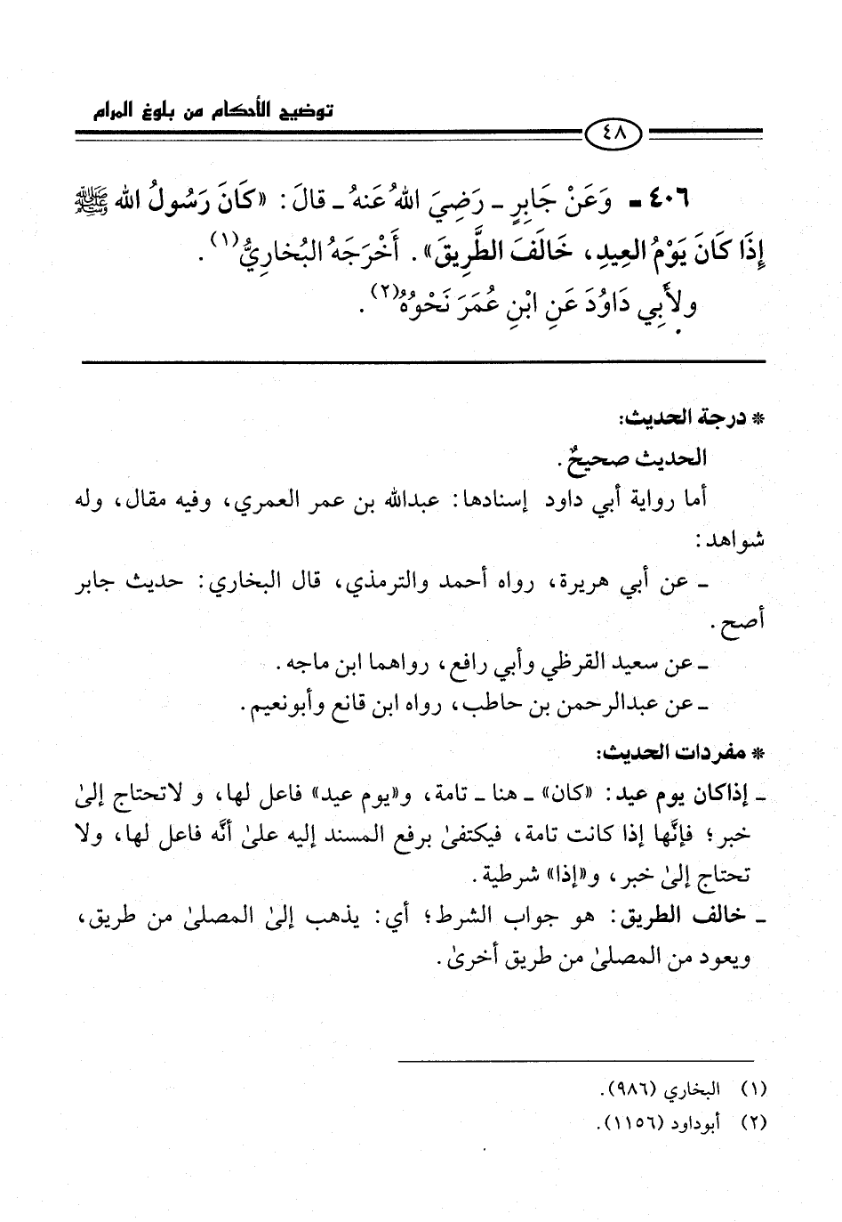 406 - وَعَنْ جَابِرٍ -رَضِيَ اللهُ عَنهُ- قالَ: "كَانَ رَسُولُ الله -صلى الله عليه وسلم- إِذَا كَانَ يَوْمُ العِيدِ، خَالَفَ الطَّرِيقَ". أَخْرَجَهُ البُخارِيُّ (¬1).