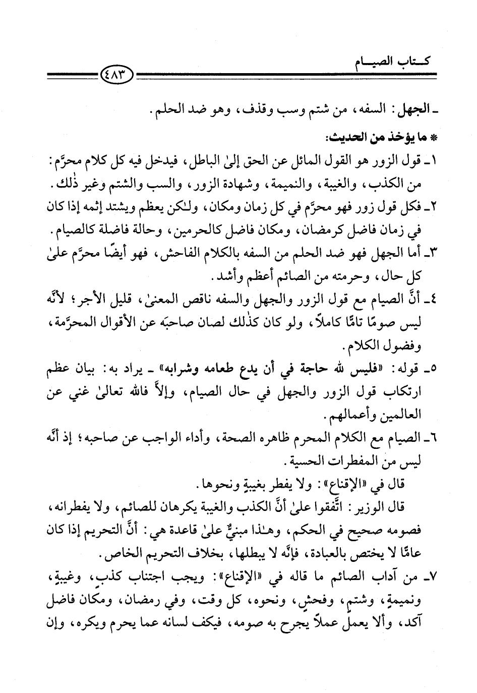 7 - من آداب الصائم ما قاله في "الإقناع": ويجب اجتناب كذبٍ، وغيبةٍ، ونميمةٍ، وشتمٍ، وفحشٍ، ونحوه، كل وقت، وفي رمضان، ومكان فاضل آكد، وألا يعمل عملاً يجرح به صومه، فيكف لسانه عما يحرم ويكره، وإن