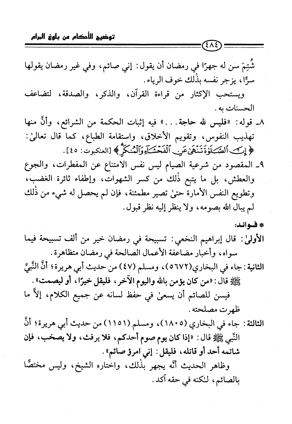 8 - قوله: "فليس لله حاجة ... " فيه إثبات الحكمة من الشرائع، وأنَّ منها تهذيب النفوس، وتقويم الأخلاق، واستقامة الطباع، كما قال تعالى: {إِنَّ الصَّلَاةَ تَنْهَى عَنِ الْفَحْشَاءِ وَالْمُنْكَرِ} [العنكبوت: 45].
