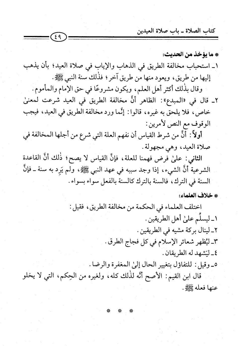 2 - قال في "المبدع": الظاهر أنَّ مخالفة الطريق في العيد شرعت لمعنى خاص، فلا يلحق به غيره، قالوا: إنَّما ورد مخالفة الطريق في العيد، فيجب الوقوف مع النص لأمرين:
