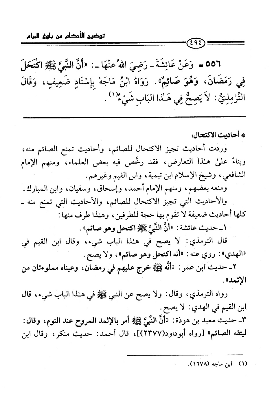 556 - وَعَنْ عَائِشَةَ -رَضِيَ اللهُ عنْهَا-: "أَنَّ النَّبِيَّ -صلى الله عليه وسلم- اكْتَحَلَ فِي رَمَضَانَ، وَهُوَ صَائِمٌ". رَوَاهُ ابْنُ مَاجَهْ بإِسْنَادٍ ضَعِيفٍ، وَقَالَ التِّرْمِذِيُّ: لاَ يَصِحُّ فِي هَذا البَابِ شَيءٌ (¬1).
