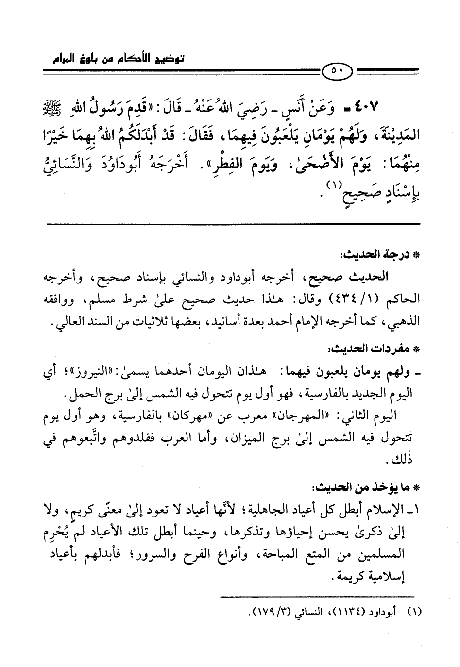 407 - وَعَنْ أَنَسٍ -رَضِيَ اللهُ عَنْهُ- قَالَ: "قَدِمَ رَسُولُ اللهِ -صلى الله عليه وسلم- المَدِيْنَةَ، وَلَهُمْ يَوْمَانِ يَلْعَبُونَ فِيهِمَا، فَقَالَ: قَدْ أبْدَلَكُمُ اللهُ بِهِمَا خَيْرًا مِنْهُمَا: يَوْمَ الأَضْحَى، وَيَومَ الفِطْرِ". أَخْرَجَهُ أَبُو دَاوُدَ وَالنَّسَائِيُّ بإِسْنَادٍ صَحِيحٍ (¬1).