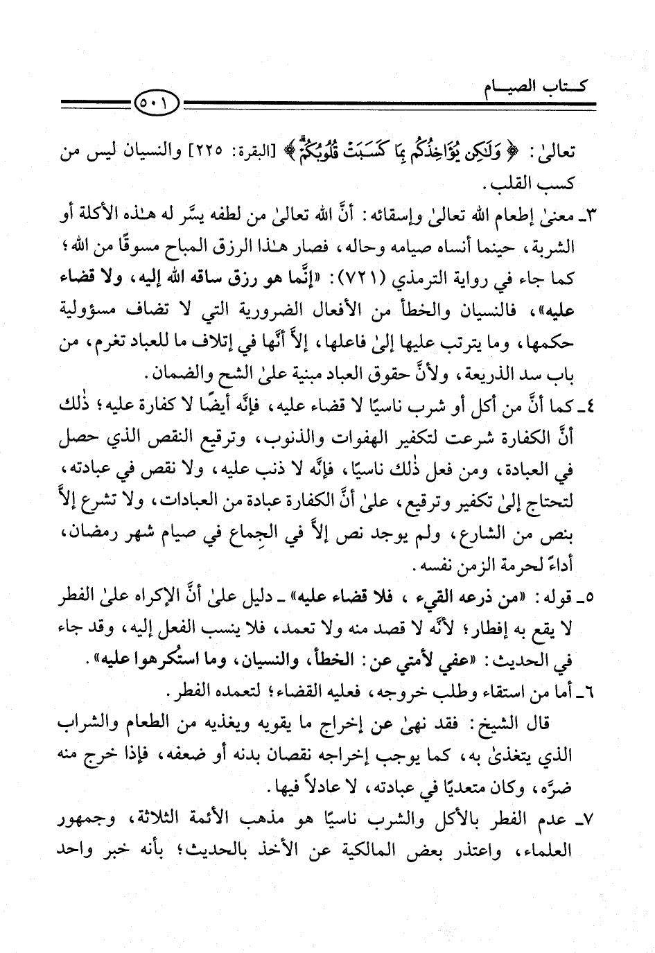 7 - عدم الفطر بالأكل والشرب ناسيًا هو مذهب الأئمة الثلاثة، وجمهور العلماء، واعتذر بعض المالكية عن الأخذ بالحديث؛ بأنه خبر واحد