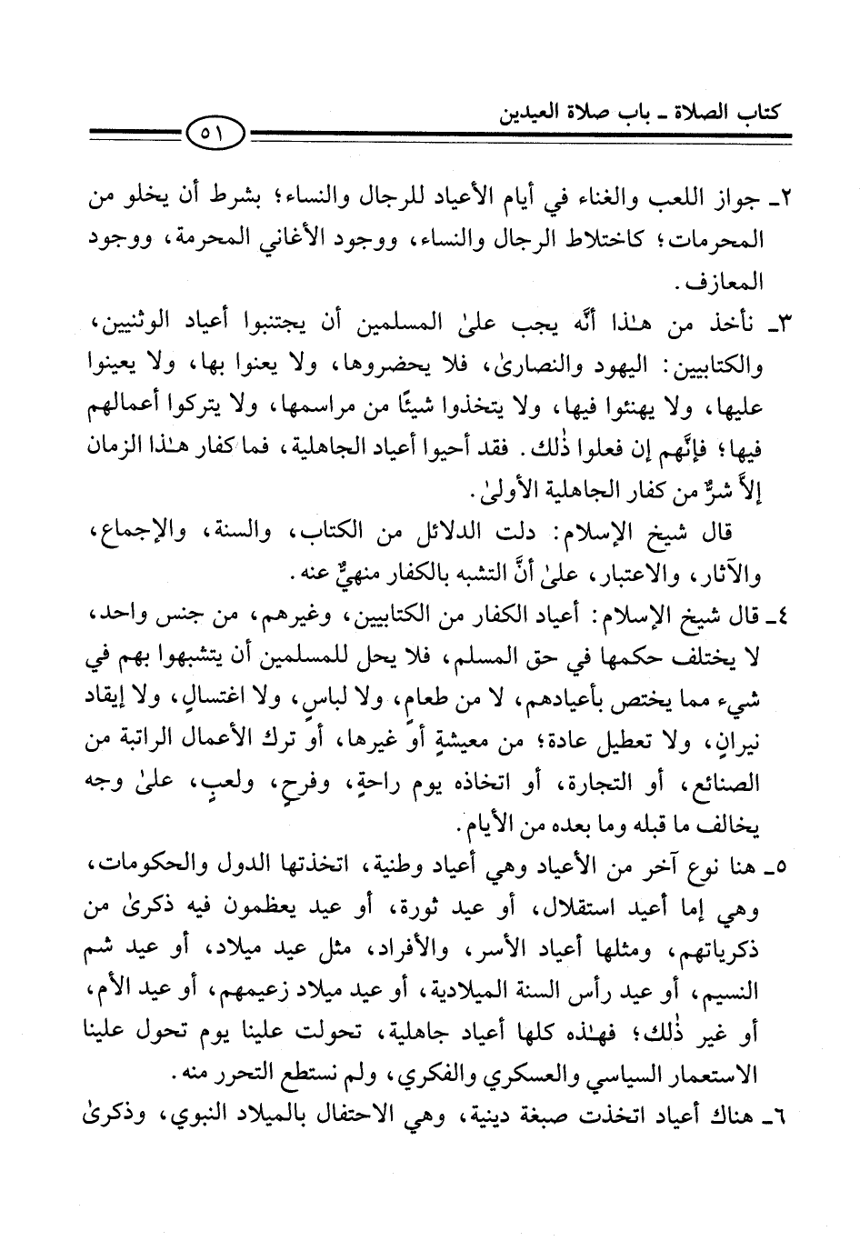 3 - نأخذ من هذا أنَّه يجب على المسلمين أن يجتنبوا أعياد الوثنيين، والكتابيين: اليهود والنصارى، فلا يحضروها، ولا يعنوا بها، ولا يعينوا عليها، ولا يهنئوا فيها، ولا يتخذوا شيئًا من مراسمها، ولا يتركوا أعمالهم فيها؛ فإنَّهم إن فعلوا ذلك. فقد أحيوا أعياد الجاهلية، فما كفار هذا الزمان إلاَّ شرٌّ من كفار الجاهلية الأولى.