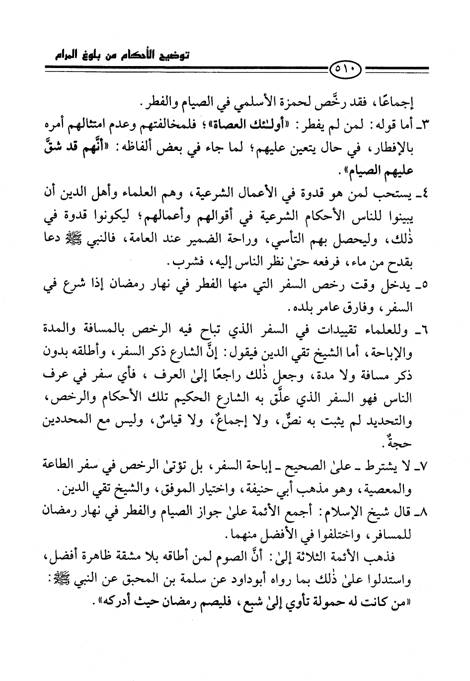 8 - قال شيخ الإسلام: أجمع الأئمة على جواز الصيام والفطر في نهار رمضان للمسافر، واختلفوا في الأفضل منهما.