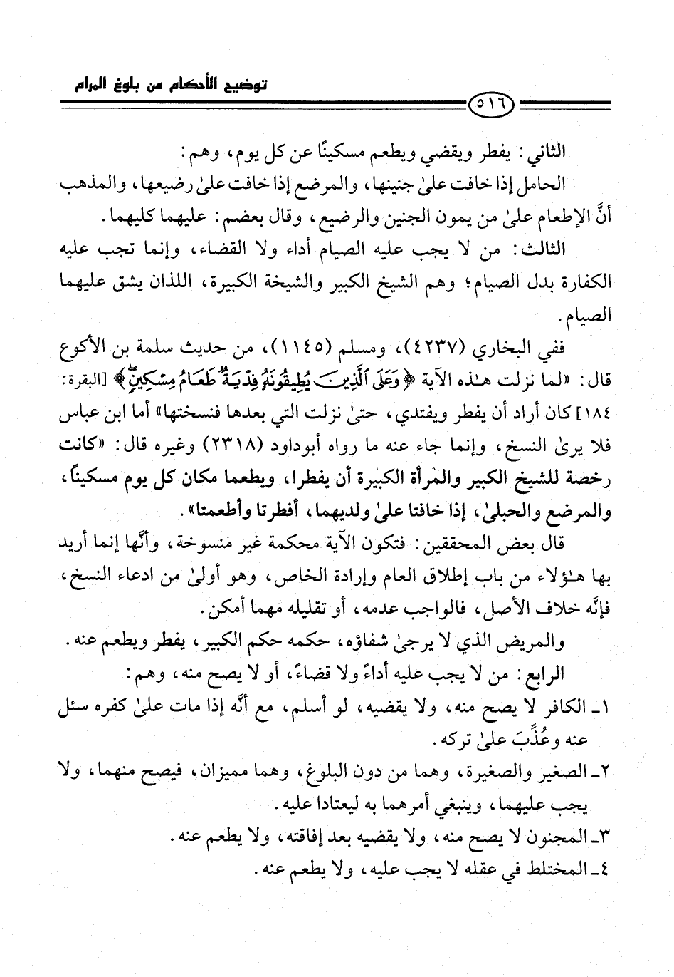 والمريض الذي لا يرجى شفاؤه، حكمه حكم الكبير، يفطر ويطعم عنه. الرابع: من لا يجب عليه أداءً ولا قضاءً، أو لا يصح منه، وهم: