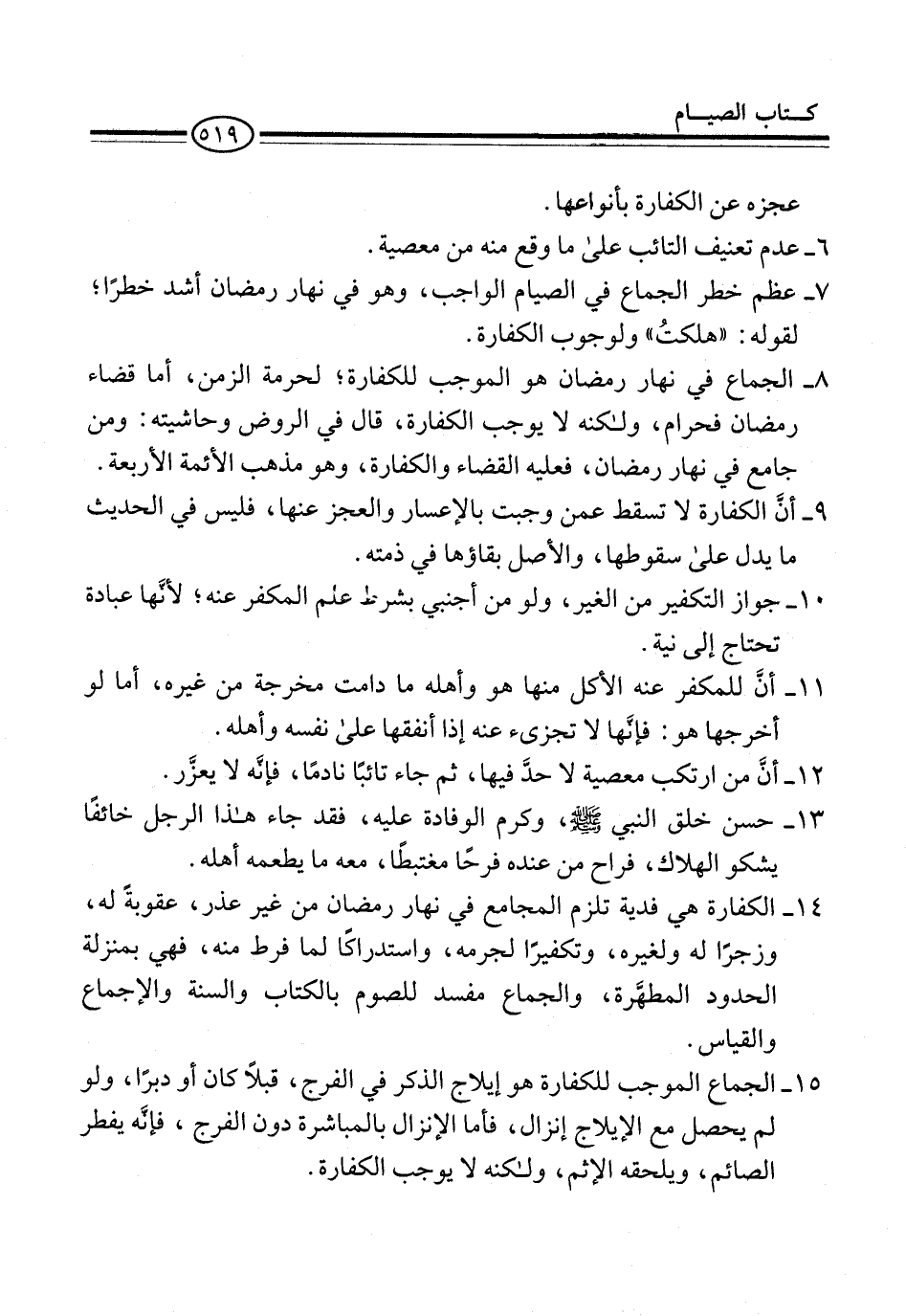 14 - الكفارة هي فدية تلزم المجامع في نهار رمضان من غير عذر، عقوبةً له، وزجزًا له ولغيره، وتكفيرًا لجرمه، واستدراكًا لما فرط منه، فهي بمنزلة الحدود المطهَّرة، والجماع مفسد للصوم بالكتاب والسنة والإجماع والقياس.