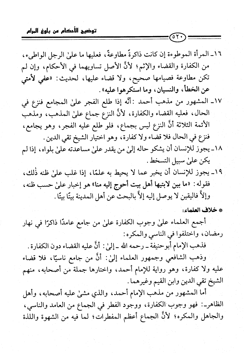 17 - المشهور من مذهب أحمد: أنَّه إذا طلع الفجر على المجامع فنزع في الحال، فعليه القضاء والكفارة، لأنَّ النزع جماع على المذهب، ومذهب الأئمة الثلاثة أنَّ النزع ليس بجماع، فلو طلع عليه الفجر، وهو يجامع، فنزع في الحال فلا قضاء ولا كفارة، وهو اختيار الشيخ تقي الدين.