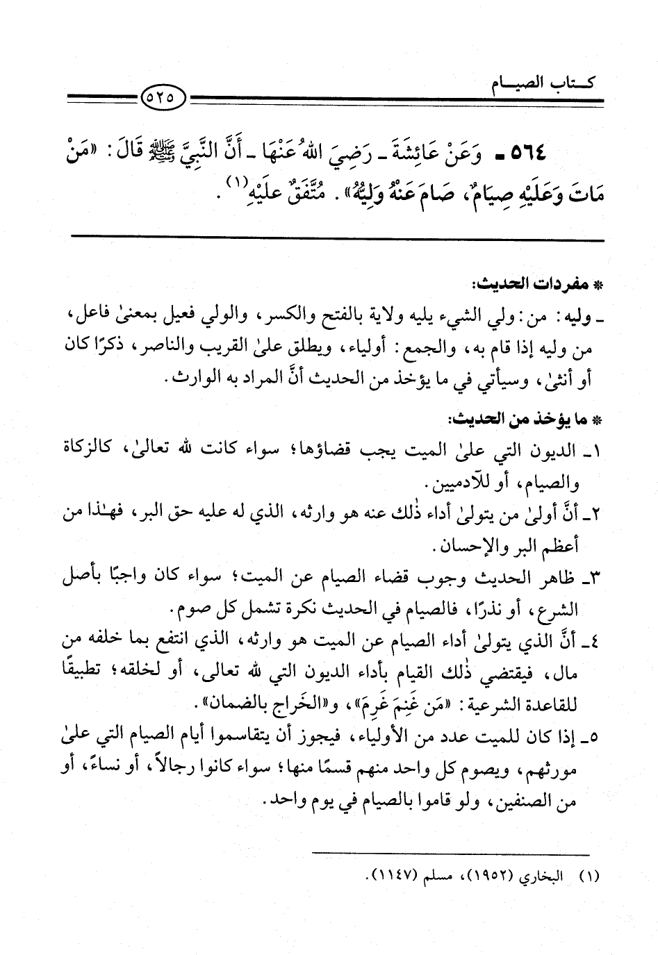564 - وَعَنْ عَائِشَةَ -رَضِيَ اللهُ عَنْهَا- أَنَّ النَّبِيَّ -صلى الله عليه وسلم- قَالَ: "مَنْ مَاتَ وَعَلَيْهِ صِيَامٌ، صَامَ عَنْهُ وَلِيُّهُ". مُتَّفَقٌ علَيْهِ (¬1).