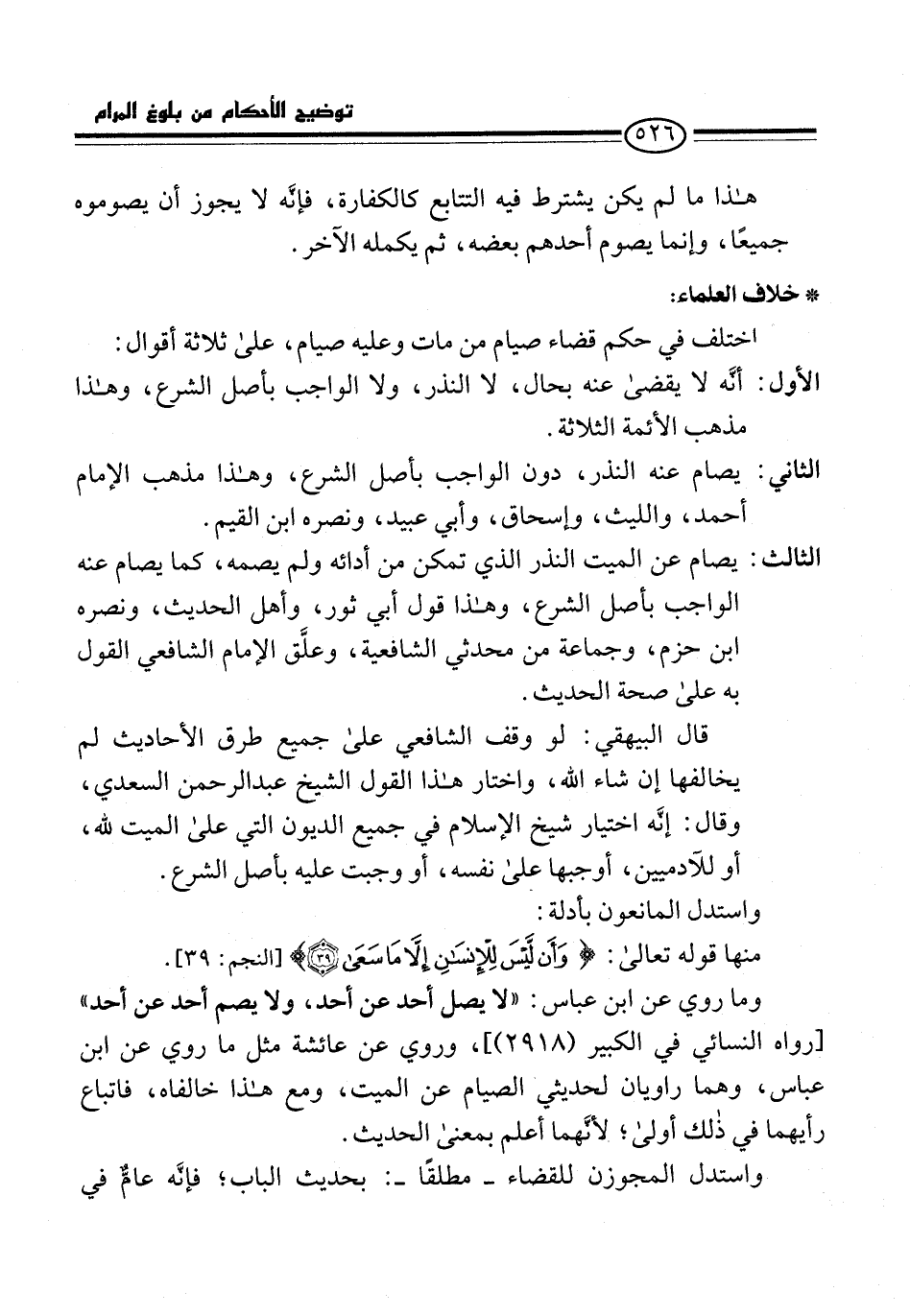 وما روي عن ابن عباس: "لا يصل أحد عن أحد، ولا يصم أحد عن أحد" [رواه النسائي في الكبير 29181)]، وروي عن عائشة مثل ما روي عن ابن عباس، وهما راويان لحديثي الصيام عن الميت، ومع هذا خالفاه، فاتباع رأيهما في ذلك أولى، لأنَّهما أعلم بمعنى الحديث.