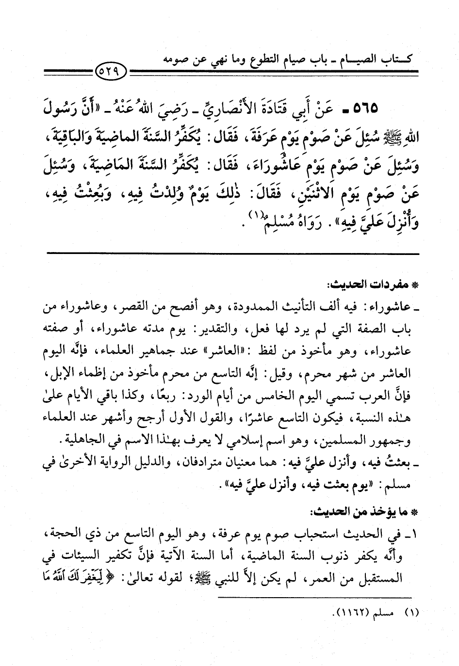565 - عَنْ أَبِي قَتَادَةَ الأنْصَارِيِّ -رَضِيَ اللهُ عَنْهُ- "أَنَّ رَسُولَ اللهِ -صلى الله عليه وسلم- سُئِلَ عَنْ صَوْمِ يَوْمِ عَرَفَةَ، فَقَال: يُكَفِّرُ السَّنَةَ الماضِيَةَ وَالبَاقِيَةَ، وَسُئِلَ عَنْ صَوْمِ يَوْمِ عَاشورَاءَ، فَقَال: يُكَفِّرُ السَّنَةَ الماضِيَةَ، وَسُئِلَ عَنْ صَوْمِ يَوْمِ الاثْنَيْنِ، فَقَالَ: ذلِكَ يَوْمٌ وُلِدْتُ فِيهِ، وَبُعِثْتُ فِيهِ، وَأُنْزِلَ عَليَّ فِيهِ". رَوَاهُ مُسْلِمٌ (¬1).