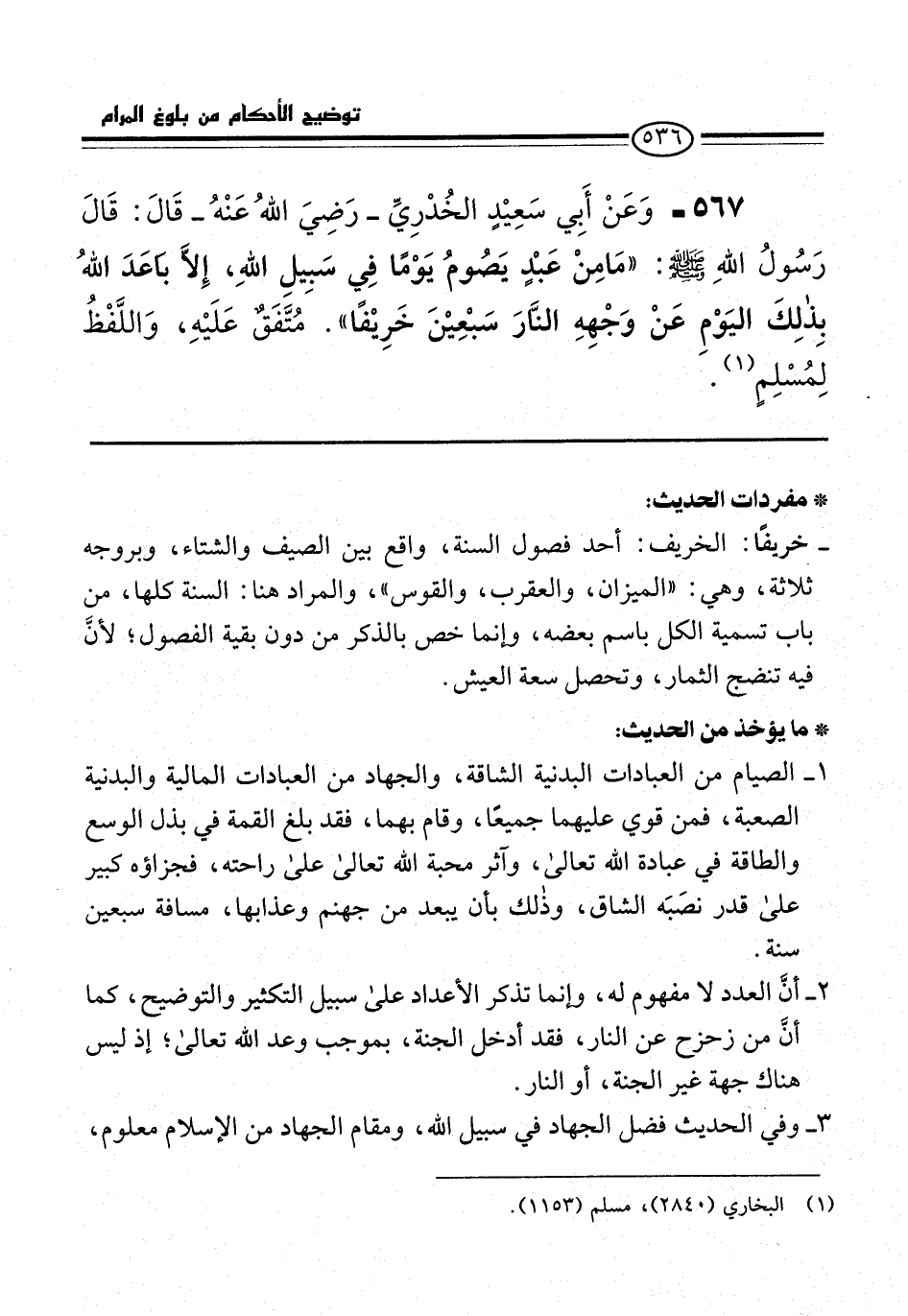 567 - وَعَنْ أَبِي سَعِيْدٍ الخُدْرِيِّ -رَضِيَ اللهُ عَنْهُ- قَالَ: قَالَ رَسُولُ اللهِ -صلى الله عليه وسلم-: "مَا مِنْ عَبْدٍ يَصُومُ يَوْمًا فِي سَبِيلِ اللهِ، إِلاَّ بَاعَدَ اللهُ بِذلِكَ اليَوْمِ عَنْ وَجْهِهِ النَّارَ سَبْعِيْنَ خَرِيْفًا". مُتَّفَقٌ عَلَيْهِ، وَاللَّفْظُ لِمُسْلِمٍ (¬1).