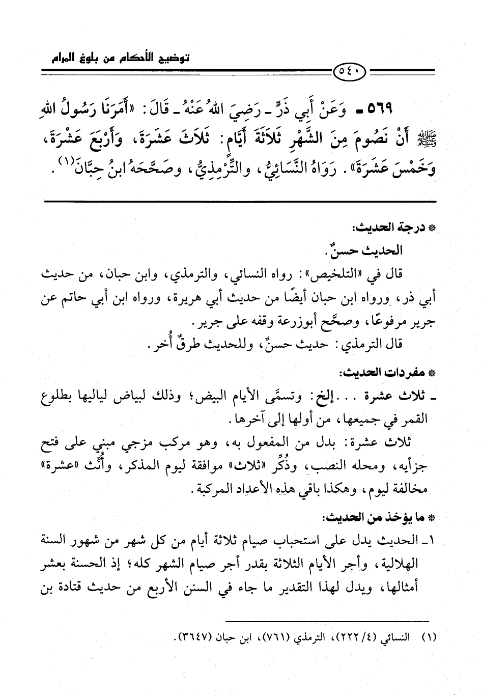 569 - وَعَنْ أَبِي ذَرٍّ -رَضِيَ اللهُ عَنْهُ- قَالَ: "أَمَرَنَا رَسُولُ اللهِ -صلى الله عليه وسلم- أَنْ نَصُومَ مِنَ الشَّهْرِ ثَلَاثَةَ أَيَّامِ: ثَلَاثَ عَشَرَةَ، وَأَرْبَعَ عَشْرَةَ، وَخَمْسَ عَشَرَةَ". رَوَاهُ النَّسَائِيُّ، والتِّرمِذِيُّ، وصَحَّحَهُ ابنُ حِبَّانَ (¬1).