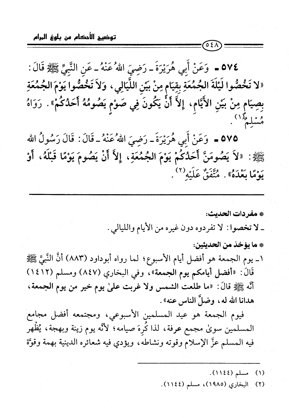 574 - وَعَنْ أَبِي هُرَيْرَةَ -رَضِيَ اللهُ عَنْهُ- عَنِ النَّبِيِّ -صلى الله عليه وسلم- قَالَ: "لا تَخُصُّوا لَيْلَةَ الجُمُعَةِ بقِيَامٍ مِنْ بَيْنِ اللَّيَالِي، وَلَا تَخُصُّوا يَوْمَ الجُمُعَةِ بِصِيَامٍ مِنْ بَيْنِ الأَيَّام، إِلاَّ أنْ يَكُونَ فِي صَوْمٍ يَصُومُهُ أحَدُكُمْ". رَوَاهُ مُسْلِمٌ (¬1).