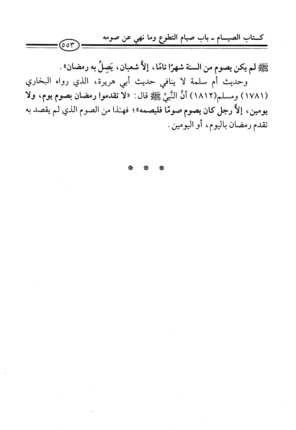 وحديث أم سلمة لا ينافي حديث أبي هريرة، الذي رواه البخاري (1781) ومسلم (1812) أنَّ النَّبيَّ -صلى الله عليه وسلم- قال: "لا تقدموا رمضان بصوم يوم، ولا يومين، إلاَّ رجل كان يصوم صومًا فليصمه"؛ فهذا من الصوم الذي لم يقصد به تقدّم رمضان باليوم، أو اليومين.