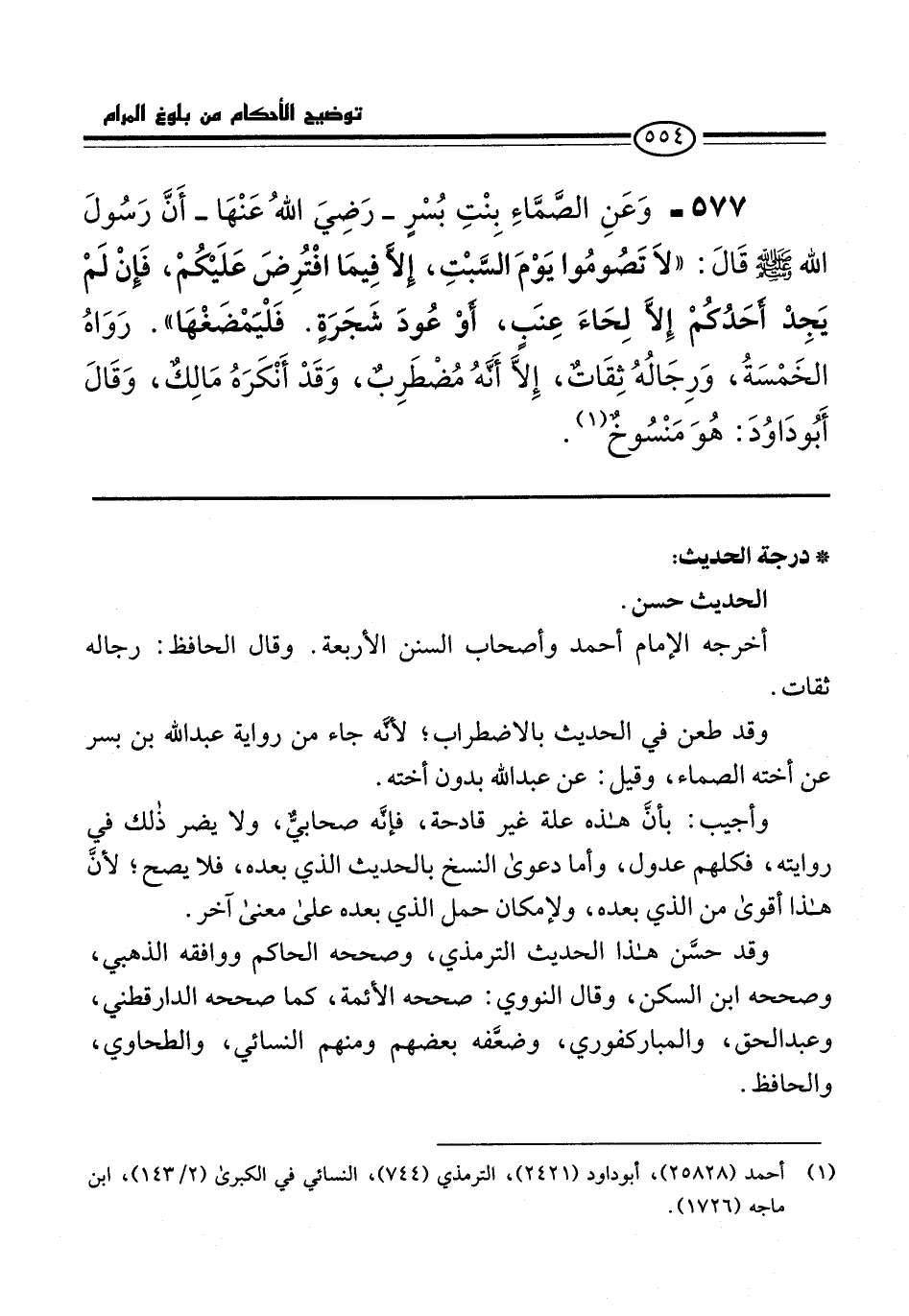 577 - وَعَنِ الصَّمَّاءِ بِنْتِ بُسْرٍ -رَضِيَ اللهُ عَنْهَا- أَنَّ رَسُولَ الله -صلى الله عليه وسلم- قَالَ: "لَا تَصُومُوا يَوْمَ السَّبْتِ، إِلاَّ فِيمَا افْتُرِضَ عَلَيْكُمْ، فَإِنْ لَمْ يَجِدْ أحَدُكُمْ إِلاَّ لِحَاءَ عِنَبٍ، أَوْ عُودَ شَجَرَةٍ. فَلْيَمْضَغْهَا". رَوَاهُ الخَمْسَةُ، وَرِجَالُهُ ثِقَاتٌ، إِلاَّ أَنَّهُ مُضْطَرِبٌ، وَقَدْ أَنْكَرَهُ مَالِكٌ، وَقَالَ أَبُو دَاوُدَ: هُوَ مَنْسُوخٌ (¬1).