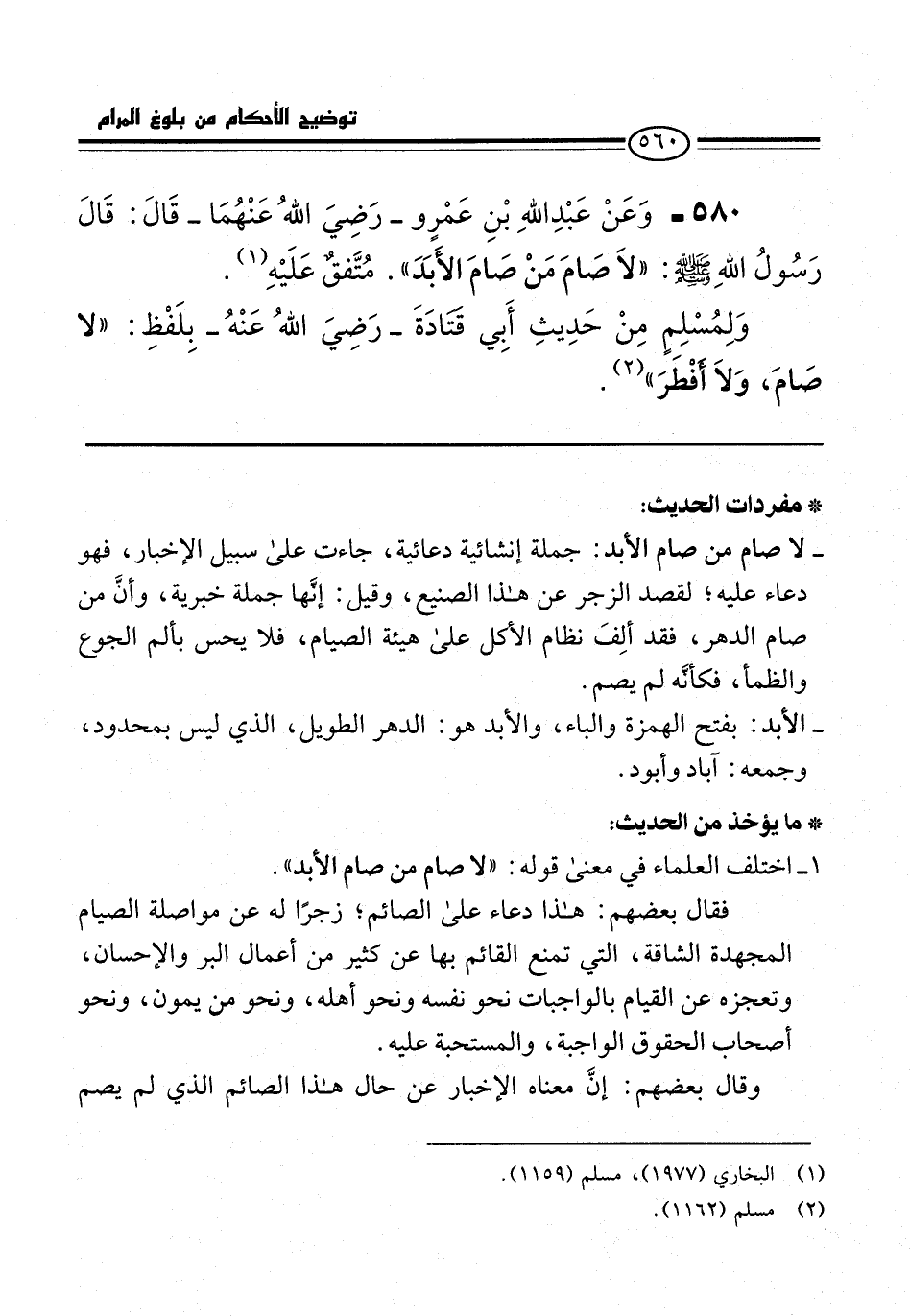 580 - وَعَنْ عَبْدِ اللهِ بْنِ عَمْرو -رَضِيَ اللهُ عَنْهُمَا- قَالَ: قَالَ رَسُولُ اللهِ -صلى الله عليه وسلم-: "لَا صَامَ مَنْ صَامَ الأَبَدَ". مُتَّفقٌ عَلَيْهِ (¬1).