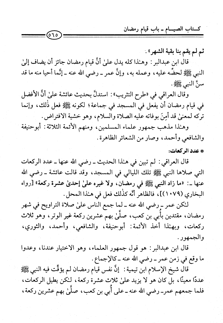 قال ابن عبد البر: وهذا كله يدل على أنَّ قيام رمضان جائز أن يضاف إلى النبي -صلى الله عليه وسلم- لحضِّه عليه، وعمله به، وإنَّ عمر -رضي الله عنه- إنَّما أحيا منه ما قد سنَّ النبي -صلى الله عليه وسلم-.
