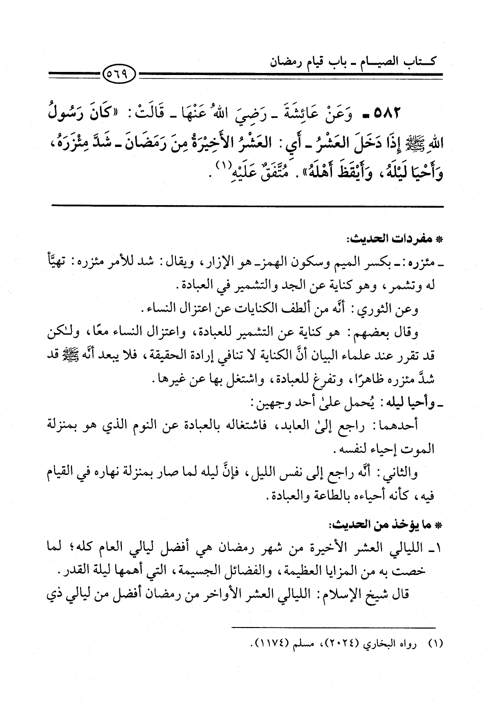 582 - وَعَنْ عَائِشَةَ -رَضِيَ اللهُ عَنْهَا- قَالَتْ: "كانَ رَسُولُ اللهِ -صلى الله عليه وسلم- إِذَا دَخَلَ العَشْرُ -أيِ: العَشْرُ الأَخِيْرَةُ مِنَ رَمَضَانَ- شَدَّ مِئْزَرَهُ، وَأَحْيَا لَيْلَهُ، وَايْقَظَ أَهْلَهُ". مُتَّفَقٌ عَلَيْهِ (¬1).