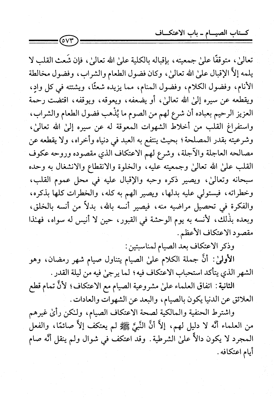 تعالى، متوقفًا على جمعيته، بإقباله بالكلية على الله تعالى، فإن شَعث القلب لا يلمه إلاَّ الإقبال على الله تعالى، وكان فضول الطعام والشراب، وفضول مخالطة الأنام، وفضول الكلام، وفضول المنام، مما يزيده شعثًا، ويشتته في كل وادٍ، ويقطعه عن سيره إلى الله تعالى، أو يضعفه، ويعوقه، ويوقفه، اقتضت رحمة العزيز الرحيم بعباده أن شرع لهم من الصوم ما يُذْهب فضول الطعام والشراب، واستفراغ القلب من أخلاط الشهوات المعوقة له عن سيره إلى الله تعالى، وشرعيته بقدر المصلحة؛ بحيث ينتفع به العبد في دنياه وأخراه، ولا يقطعه عن مصالحه العاجلة والآجلة، وشرع لهم الاعتكاف الذي مقصوده وروحه عكوف القلب على الله تعالى وجمعيته عليه، والخلوة والانقطاع والانشغال به وحده سبحانه وتعالى، ويصير ذكره وحبه والإقبال عليه في محل عموم القلب، وخطراته، فيستولي عليه بدلها، ويصير الهم به كله، والخطرات كلها بذكره، والفكرة في تحصيل مراضيه منه، فيصير أنسه بالله، بدلًا من أنسه بالخلق، وبعده بذلك، لأنسه به يوم الوحشة في القبور، حين لا أنيس له سواه، فهذا مقصود الاعتكاف الأعظم.