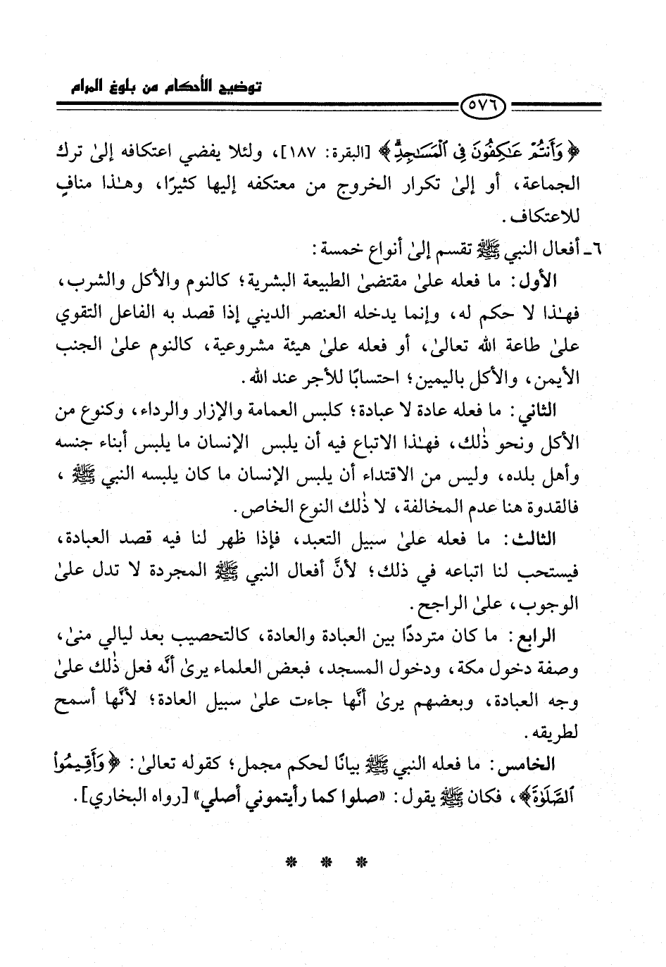 الخامس: ما فعله النبي -صلى الله عليه وسلم- بيانًا لحكم مجمل؛ كقوله تعالى: {فَأَقِيمُوا الصَّلَاةَ وَآتُوا الزَّكَاةَ}، فكان -صلى الله عليه وسلم- يقول: "صلوا كلما رأيتموني أصلي" [رواه البخاري].