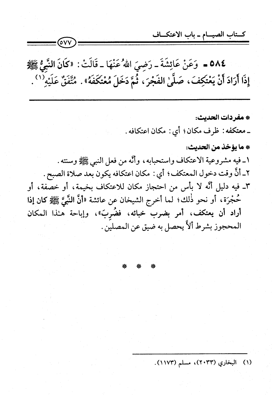 584 - وَعَنْ عَائِشَةَ -رَضِيَ اللهُ عَنْهَا- قَالَتْ: "كَانَ النَّبِيُّ -صلى الله عليه وسلم- إِذَا أَرَادَ أَنْ يَعْتَكِفَ، صَلَّى الفَجْرَ، ثُمَّ دَخَلَ مُعْتَكَفَهُ". مُتَّفَقٌ عَلَيْهِ (¬1).