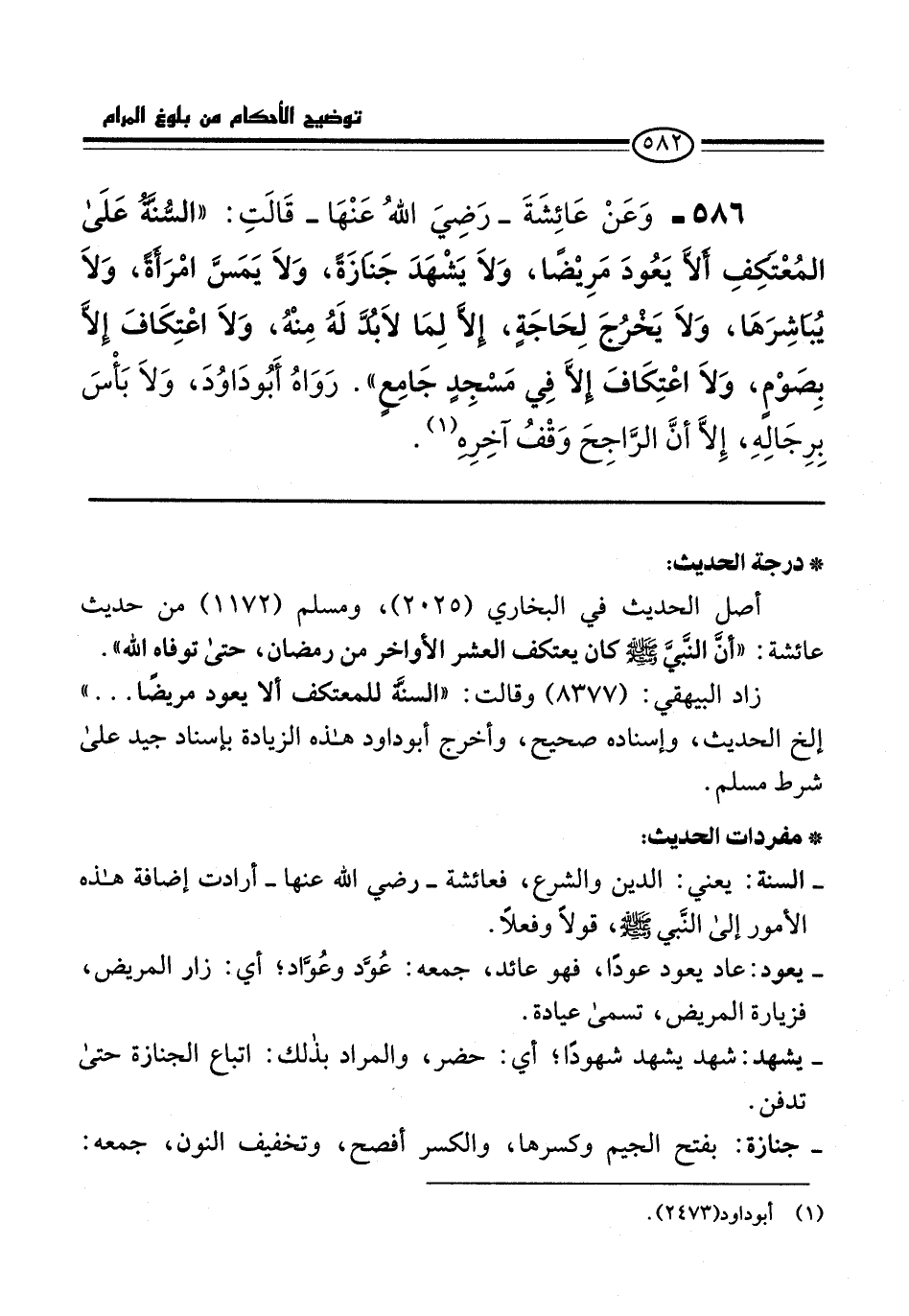 586 - وَعَنْ عَائِشَةَ -رَضِيَ اللهُ عَنْهَا- قَالَتِ: "السُّنَّة عَلَى المُعْتكِفِ أَلاَّ يَعُودَ مَرِيْضًا، وَلَا يَشْهَدَ جَنَازَةً، وَلَا يَمَسَّ امْرَأَهًّ، وَلَا يُبَاشِرَهَا، وَلَا يَخرُجَ لِحَاجَةٍ، إِلاَّ لِمَا لَابُدَّ لَهُ مِنْهُ، وَلَا اعْتِكَافَ إلاَّ بِصَوْمٍ، وَلَا اعْتِكَافَ إِلاَّ فِي مَسْجِدٍ جَامِعٍ". رَوَاهُ أَبُو دَاوُدَ، وَلَا بَأْسَ بِرِجَالِهِ، إِلاَّ أنَّ الرَّاجِحَ وَقْفُ آخِرِهِ (¬1).