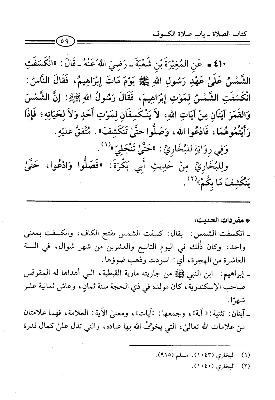 410 - عَنِ المُغِيْرَةَ بْنِ شُعْبَةَ -رَضِيَ اللهُ عَنْهُ- قَالَ: "انْكَسَفَتِ الشَّمْسُ عَلَى عَهْدِ رَسُولِ اللهِ -صلى الله عليه وسلم- يَوْمَ مَاتَ إِبْرَاهِيمُ، فَقَالَ النَّاسُ: انْكَسَفَتِ الشَّمْسُ لِمَوْتِ إِبْرَاهِيمَ، فَقَالَ رَسُولُ اللهِ -صلى الله عليه وسلم-: إنَّ الشَّمْسَ وَالقَمَرَ آيَتَانِ مِنْ آيَاتِ اللهِ، لاَ يَنْكَسِفَانِ لِمَوْتِ أحَدٍ وَلاَ لِحَيَاتِهِ؛ فَإِذَا رَأَيْتُمُوهُمَا، فَادْعُوا الله، وَصَلُّوا حتَّى تَنْكشِفَ". مُتَّفقٌ عليْهِ.