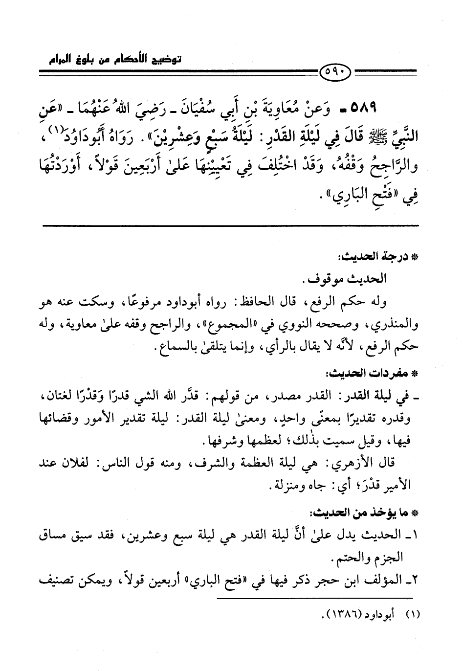 589 - وَعنْ مُعَاوِيَةَ بْنِ أَبِي سُفْيَانَ -رَضِيَ اللهُ عَنْهُمَا- "عَنِ النَّبِيِّ -صلى الله عليه وسلم- قالَ فِي لَيْلَةِ القَدْرِ: لَيْلَةُ سَبع وَعِشْرِيْنَ". رَوَاهُ أَبُو دَاوُدَ (¬1)، والرَّاجِحُ وَقْفُهُ، وَقَدْ اخْتُلِفَ فِي تَعْيِيْنِهَا عَلى أَرْبَعِينَ قَوْلًا، أَوْرَدْتُهَا فِي "فَتْحِ البَارِي".