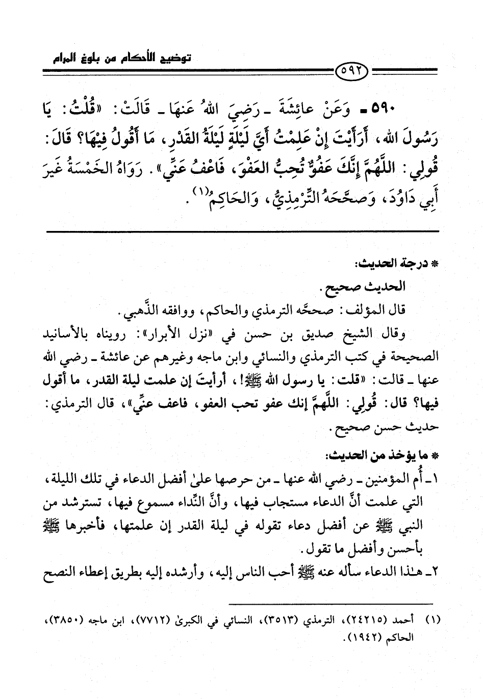 590 - وَعَنْ عائِشَةَ -رَضِيَ اللهُ عَنهَا- قَالَتْ: "قُلْتُ: يَا رَسُولَ الله، أَرَأَيْتَ إِنْ عَلِمْتُ أَيَّ لَيْلَةٍ لَيْلَةُ القَدْرِ، مَا أَقُولُ فِيْهَا؟ قَالَ: قُولِي: اللَّهُمَّ إِنَّكَ عَفُوٌّ تُحِبُّ العَفْوَ، فَاعْفُ عَنِّي". رَوَاهُ الخَمْسَةُ غَيرَ أَبِي دَاوُدَ، وَصحَّحَهُ التِّرْمِذِيُّ، وَالحَاكِمُ (¬1).