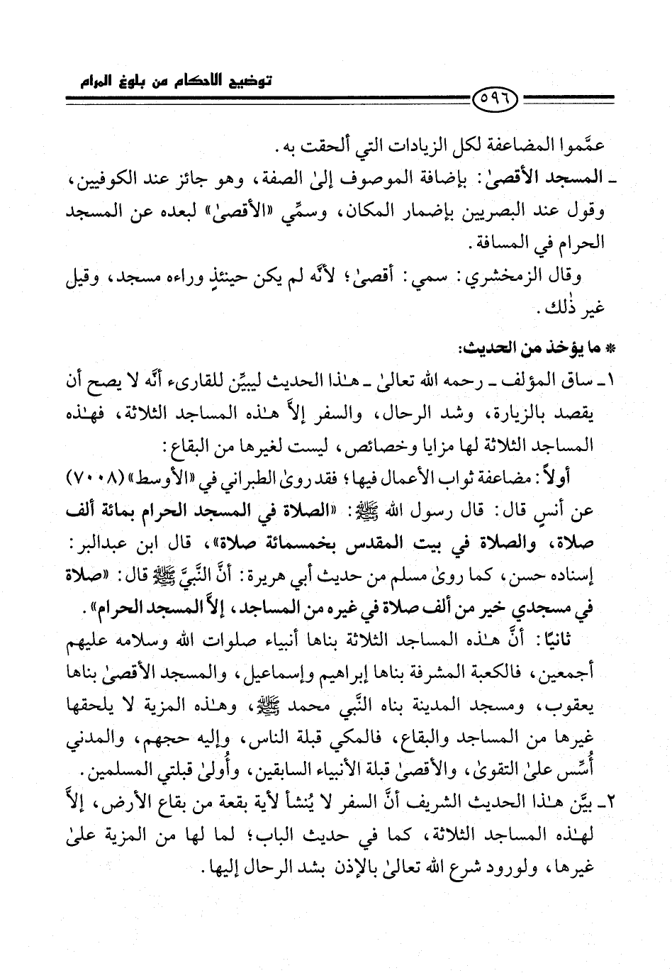 1 - ساق المؤلِّف -رحمه الله تعالى- هذا الحديث ليبيِّن للقارىء أنَّه لا يصح أن يقصد بالزيارة، وشد الرحال، والسفر إلاَّ هذه المساجد الثلاثة، فهذه المساجد الثلاثة لها مزايا وخصائص، ليست لغيرها من البقاع: