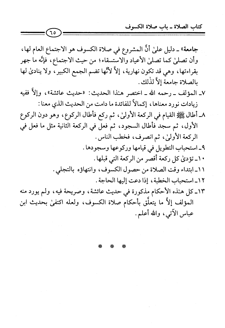 13 - كل هذه الأحكام مذكورة في حديث عائشة، وصريحة فيه، ولم يورد منه المؤلف إلاَّ ما يتعلَّق بأحكام صلاة الكسوف، ولعله اكتفى بحديث ابن عباس الآتي، والله أعلم.