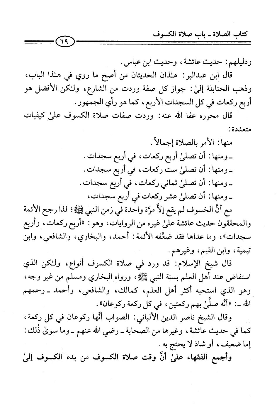 وقال الشيخ ناصر الدين الألباني: الصواب أنَّها ركوعان في كل ركعة، كما في حديث عائشة، وغيرها من الصحابة -رضي الله عنهم- وما سوى ذلك: إما ضعيف، أو شاذ لا يحتج به.