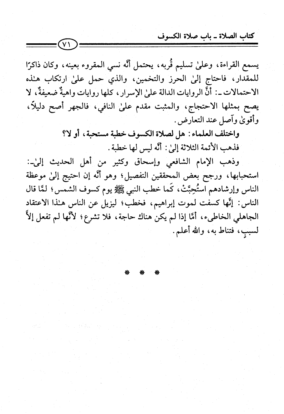 وذهب الإمام الشافعي وإسحاق وكثير من أهل الحديث إلى-: استحبابها، ورجح بعض المحققين التفصيل؛ وهو أنَّه إن احتيج إلى موعظة الناس وإرشادهم استُحِبَّتْ، كَما خطب النبي -صلى الله عليه وسلم- يوم كسوف الشمس؛ لمَّا قال الناس: إنَّها كسفت لموت إبراهيم، فخطب؛ ليزيل عن الناس هذا الاعتقاد الجاهلي الخاطىء، أمَّا إذا لم يكن هناك حاجة، فلا تشرع؛ لأنَّها لم تفعل إلاَّ لسببٍ، فتناط به، والله أعلم.