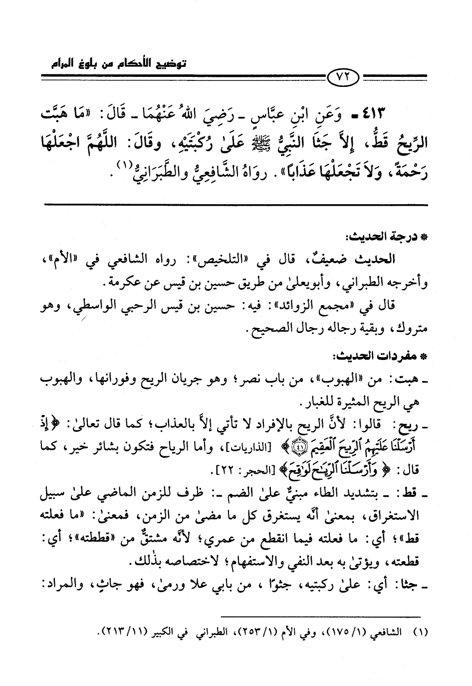 413 - وَعَنِ ابْنِ عبَّاسٍ -رَضِيَ اللهُ عَنْهُمَا- قَالَ: "مَا هَبَّت الرِّيحُ قَطُّ، إِلاَّ جَثَا النَّبِيُّ -صلى الله عليه وسلم- علَى رُكْبَتَيْهِ، وقَالَ: اللَّهُمَّ اجْعَلْهَا رَحْمَةً، وَلاَ تَجْعَلْهَا عَذَابًا". روَاهُ الشَّافِعِيُّ والطَّبَرَانِيُّ (¬1).