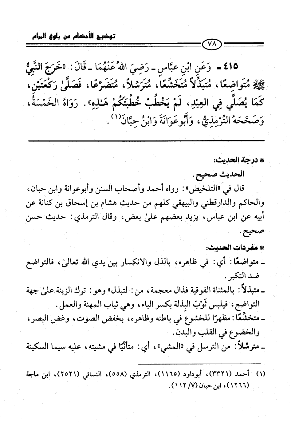 415 - وَعَنِ ابْنِ عبَّاسٍ -رَضِيَ اللهُ عَنْهُمَا- قَالَ: "خَرَجَ النَّبِيُّ -صلى الله عليه وسلم- مُتَواضِعًا، مُتَبذَّلاً مُتَخَشِّعًا، مُتَرَسِّلاً، مُتَضَرِّعاً، فَصَلَّى رَكْعَتَيْنِ، كَمَا يُصَلِّي فِي العِيْدِ، لَمْ يَخطُبْ خُطْبتَكُمْ هَذِهِ". رَوَاهُ الخَمْسَةُ، وَصَحَّحَهُ التِّرْمِذِيُّ، وَأَبُو عَوَانَةَ وَابْنُ حِبَّانَ (¬1).
