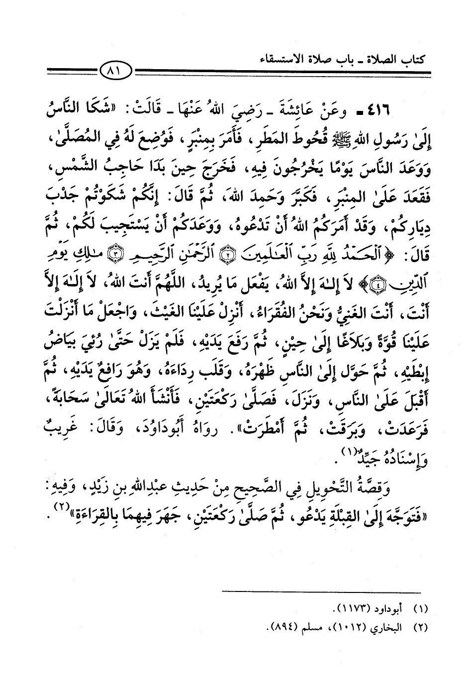 416 - وعَنْ عَائِشَةَ -رَضِيَ اللهُ عَنْهَا- قَالَتْ: "شَكَا النَّاسُ إِلَى رَسُولِ اللهِ -صلى الله عليه وسلم- قُحُوطَ المَطَرِ، فَأَمَرَ بِمِنْبَرٍ، فَوُضِعَ لَهُ فِي المُصَلَّى، وَوَعَدَ النَّاسَ يَوْمًا يَخْرُجُونَ فِيهِ، فَخَرَجَ حِينَ بَدَا حَاجِبُ الشَّمْسِ، فَقَعَدَ عَلَى المِنْبَرِ، فَكَبَّرُ وَحَمِدَ اللهَ، ثُمَّ قَالَ: إِنَّكُمْ شَكَوْتُمْ جَدْبَ دِيَارِكُمْ، وَقَدْ أمَرَكُمُ اللهُ أنْ تَدْعُوهُ، وَوَعَدَكُمْ أنْ يَسْتَجِيبَ لَكُمْ، ثُمَّ قَالَ: {الْحَمْدُ لِلَّهِ رَبِّ الْعَالَمِينَ (2) الرَّحْمَنِ الرَّحِيمِ (3) مَالِكِ يَوْمِ الدِّينِ (4)} لاَ الهَ إلاَّ اللهُ، يَفْعَل مَا يُرِيدُ، اللَّهُمَّ انتَ اللهُ، لاَ الَهَ إلاَّ أنْتَ، أنْتَ الغَنِيُّ وَنَحْنُ الفُقَرَاءُ، أَنْزِلْ عَلَيْناَ الغَيْثَ، وَاجْعَلْ مَا أنْزَلْتَ عَلَيْنَا قُوَّةٌ وَبلاَغًا إلَى حِيْنٍ، ثُمَّ رَفَعَ يَدَيْهِ، فَلَمْ يَزَلْ حَتَّى رُئيَ بيَاضُ إِبْطَيْهِ، ثُمَّ حَوَّل إلَى النَّاسِ ظَهْرَهُ، وَقَلَب رِدَاءَهُ، وَهُوَ رَافِعٌ يَدَيْهِ، ثُمَّ أقْبلَ عَلَى النَّاسِ، وَنَزَلَ، فَصَلَّى رَكْعَتَيْنِ، فَأَنْشَأَ اللهُ تَعَالَى سَحَابةً، فَرَعَدَتْ، وَبرقَتْ، ثُمَّ أمْطَرَتْ". روَاهُ أَبُو دَاوُدَ، وَقَالَ: غَرِيبٌ وَإِسْنَادُهُ جَيِّدٌ (¬1).