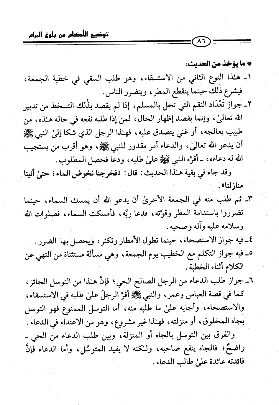 6 - جواز طلب الدعاء من الرجل الصالح الحي؛ فإنَّ هذا من التوسل الجائز، كما في قصة العباس وعمر، والنبي -صلى الله عليه وسلم- أقرَّ الرجلَ على طلبه في الاستسقاء، والاستصحاء، وأجابه على ما طلبه منه، أما التوسل الممنوع فهو التوسل بجاه المخلوق، أو منزلته، فهذا غير مشروع، وهو من الاعتداء في الدعاء.