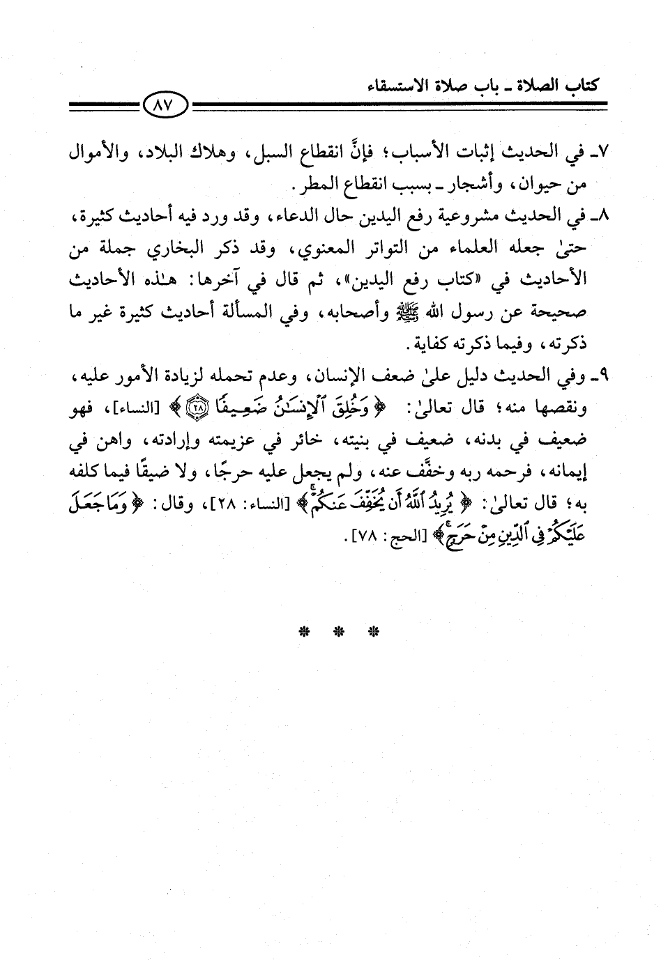 8 - في الحديث مشروعية رفع اليدين حال الدعاء، وقد ورد فيه أحاديث كثيرة، حتى جعله العلماء من التواتر المعنوي، وقد ذكر البخاري جملة من الأحاديث في "كتاب رفع اليدين"، ثم قال في آخرها: هذه الأحاديث صحيحة عن رسول الله -صلى الله عليه وسلم- وأصحابه، وفي المسألة أحاديث كثيرة غير ما ذكرته، وفيما ذكرته كفاية.