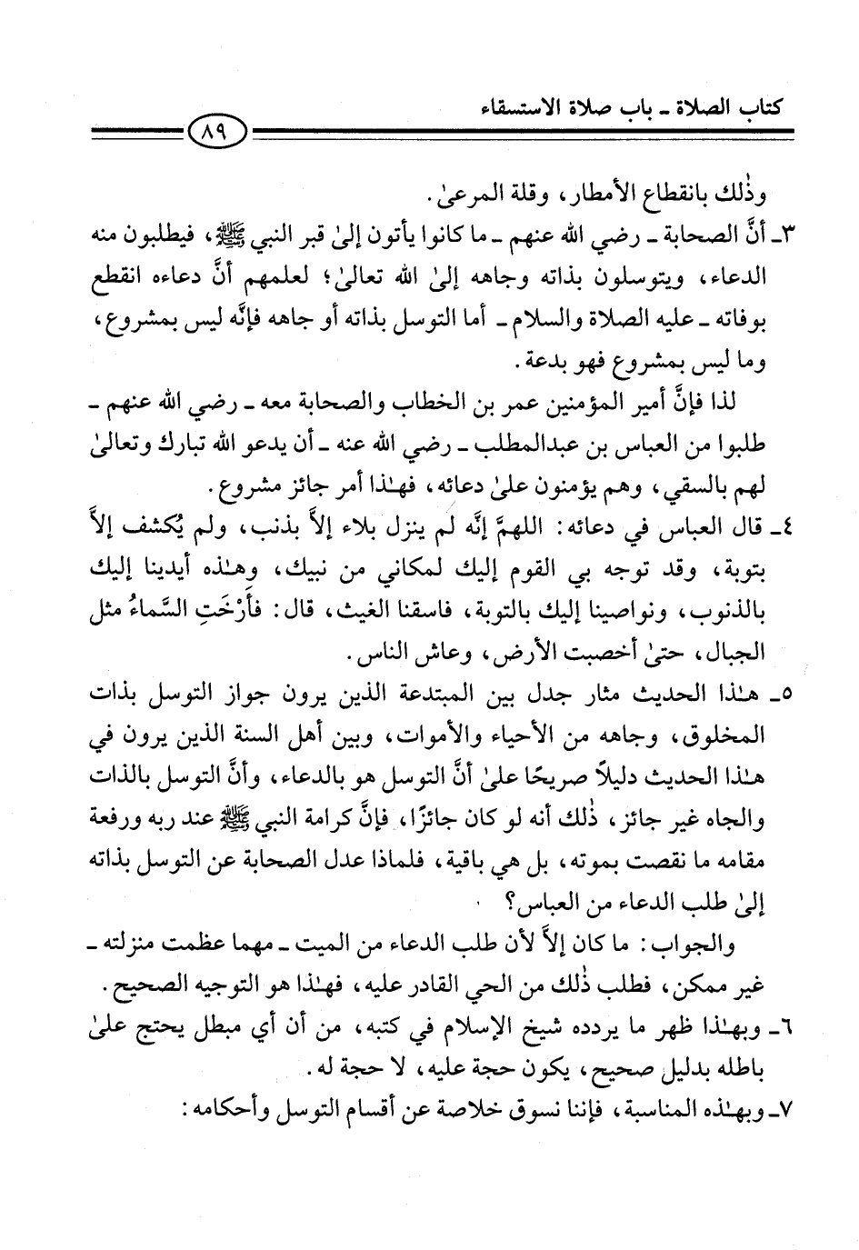 5 - هذا الحديث مثار جدل بين المبتدعة الذين يرون جواز التوسل بذات المخلوق، وجاهه من الأحياء والأموات، وبين أهل السنة الذين يرون في هذا الحديث دليلاً صريحًا على أنَّ التوسل هو بالدعاء، وأنَّ التوسل بالذات والجاه غير جائز، ذلك أنه لو كان جائزًا، فإنَّ كرامة النبي -صلى الله عليه وسلم- عند ربه ورفعة مقامه ما نقصت بموته، بل هي باقية، فلماذا عدل الصحابة عن التوسل بذاته إلى طلب الدعاء من العباس؟.