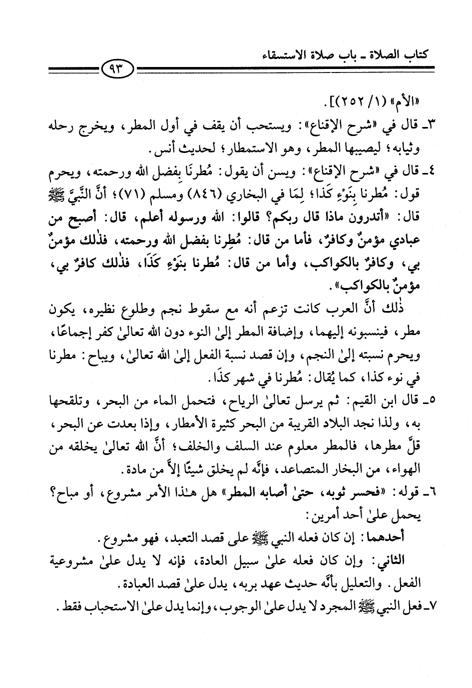 4 - قال في "شرح الإقناع": ويسن أن يقول: مُطرنَا بِفضل الله ورحمته، ويحرم قول: مُطرنا بِنَوْءِ كَذا؛ لِمَا في البخاري (846) ومسلم (71)؛ أنَّ النَّبيَّ -صلى الله عليه وسلم- قال: "أتدرون ماذا قال ربكم؟ قالوا: الله ورسوله أعلم، قال: أصبح من عبادي مؤمنٌ وكافرٌ، فأما من قال: مُطِرنا بفضل الله ورحمته، فذلك مؤمنٌ بي، وكافرٌ بالكواكب، وأما من قال: مُطرنا بنَوْءِ كَذَا، فذلك كافرٌ بي، مؤمنٌ بالكواكب".