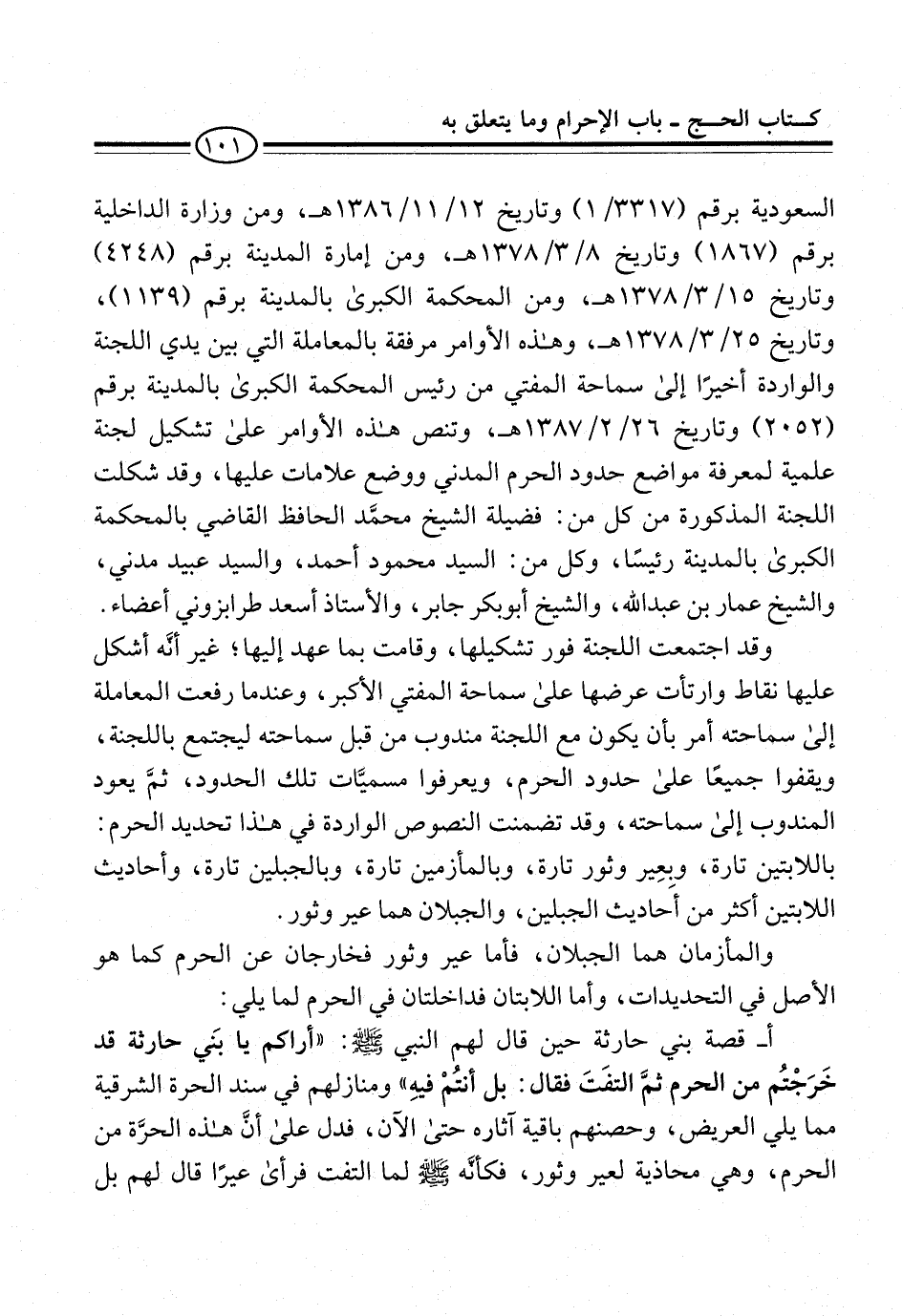السعودية برقم (1/ 3317) وتاريخ 12/ 11/ 1386 هـ، ومن وزارة الداخلية برقم (1867) وتاريخ 8/ 3/ 1378 هـ، ومن إمارة المدينة برقم (4248) وتاريخ 15/ 3/ 1378 هـ، ومن المحكمة الكبرى بالمدينة برقم (1139)، وتاريخ 25/ 3/ 1378 هـ، وهذه الأوامر مرفقة بالمعاملة التي بين يدي اللجنة والواردة أخيرًا إلى سماحة المفتي من رئيس المحكمة الكبرى بالمدينة برقم (2052) وتاريخ 26/ 2/ 1387 هـ، وتنص هذه الأوامر على تشكيل لجنة علمية لمعرفة مواضع حدود الحرم المدني ووضع علامات عليها، وقد شكلت اللجنة المذكورة من كل من: فضيلة الشيخ محمَّد الحافظ القاضي بالمحكمة الكبرى بالمدينة رئيسًا، وكل من: السيد محمود أحمد، والسيد عبيد مدني، والشيخ عمار بن عبد الله، والشيخ أبو بكر جابر، والأستاذ أسعد طرابزوني أعضاء.