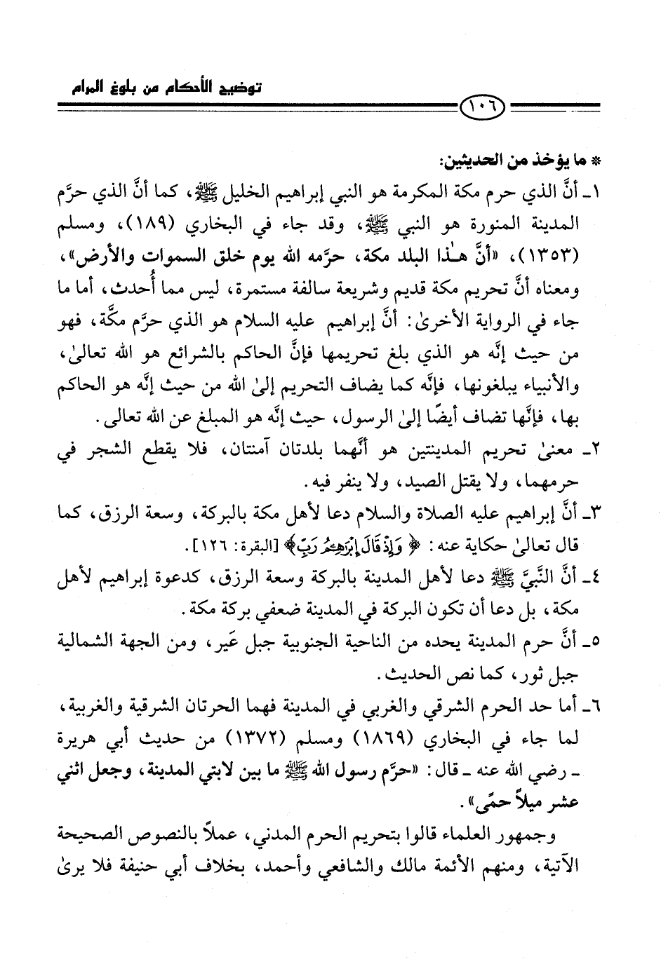 1 - أنَّ الذي حرم مكة المكرمة هو النبي إبراهيم الخليل -صلى الله عليه وسلم-، كما أنَّ الذي حرَّم المدينة المنورة هو النبي -صلى الله عليه وسلم-، وقد جاء في البخاري (189)، ومسلم (1353)، "أنَّ هذا البلد مكة، حرَّمه الله يوم خلق السموات والأرض"، ومعناه أنَّ تحريم مكة قديم وشريعة سالفة مستمرة، ليس مما أُحدث، أما ما جاء في الرواية الأخرى: أنَّ إبراهيم -عليه السلام- هو الذي حرَّم مكَّة، فهو من حيث إنَّه هو الذي بلغ تحريمها فإنَّ الحاكم بالشرائع هو الله تعالى، والأنبياء يبلغونها، فإنَّه كما يضاف التحريم إلى الله من حيث إنَّه هو الحاكم بها، فإنَّها تضاف أيضًا إِلى الرسول، حيث إنَّه هو المبلغ عن الله تعالى.