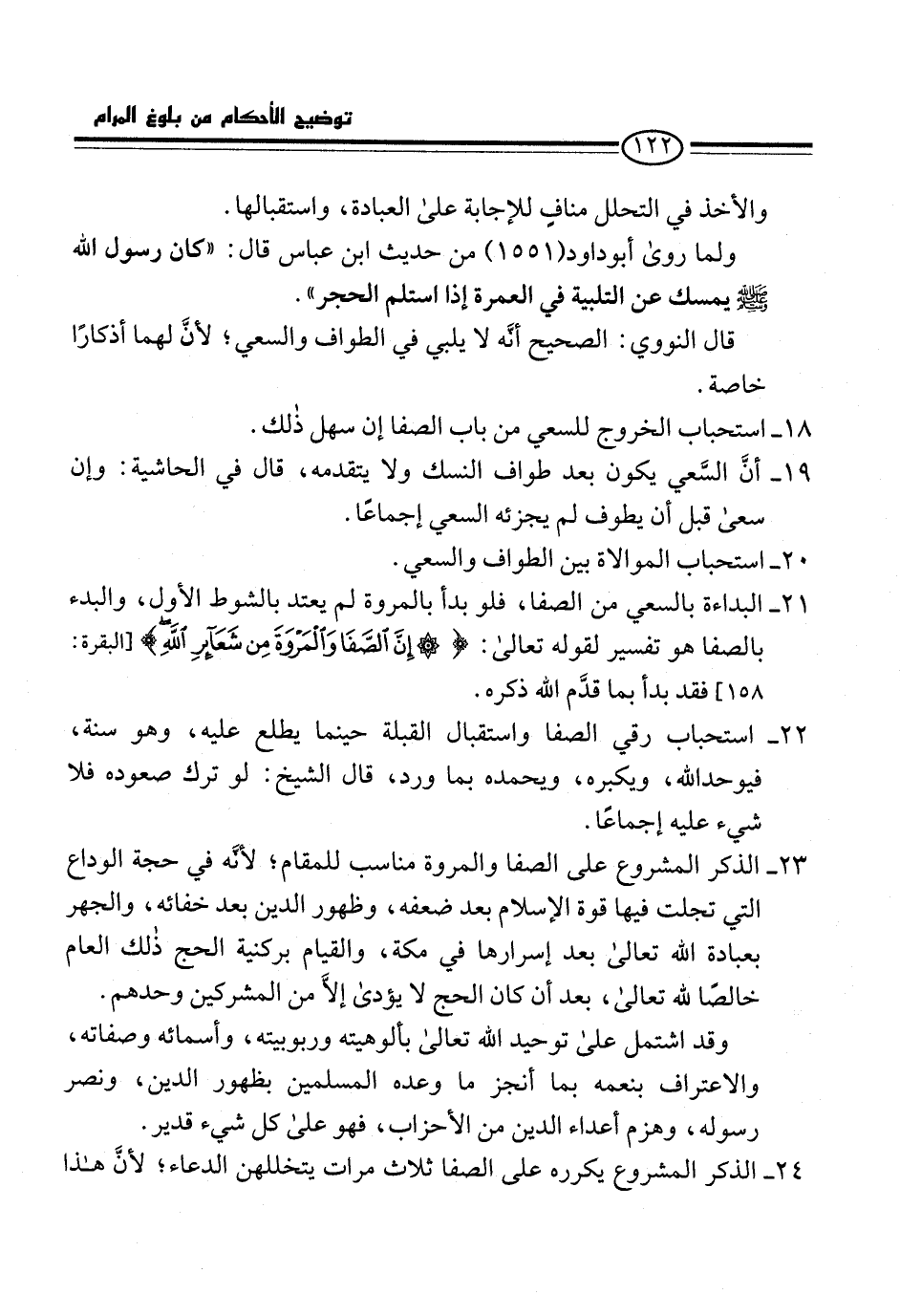 22 - استحباب رقي الصفا واستقبال القبلة حينما يطلع عليه، وهو سنة، فيوحد الله، ويكبره، ويحمده بما ورد، قال الشيخ: لو ترك صعوده فلا شيء عليه إجماعًا.