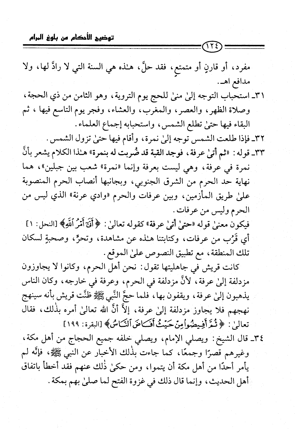 34 - قال الشيخ: ويصلي الإمام، ويصلي خلفه جميع الحجاج من أهل مكة، وغيرهم قصرًا وجمعًا، كما جاءت بذلك الأخبار عن النبي -صلى الله عليه وسلم-، فإنَّه لم يأمر أحدًا من أهل مكة أن يتموا، ومن حكى ذلك عنهم فقد أخطأ باتفاق أهل الحديث، وإنما قال ذلك في غزوة الفتح لما صلى بهم بمكة.
