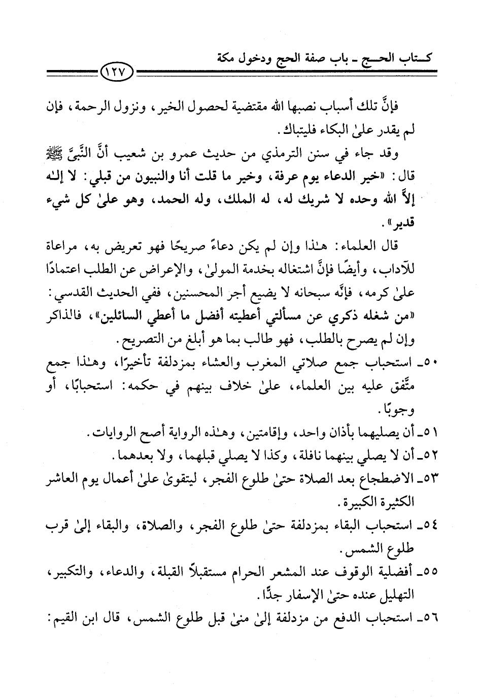 55 - أفضلية الوقوف عند المشعر الحرام مستقبلاً القبلة، والدعاء، والتكبير، التهليل عنده حتى الإسفار جدًّا.