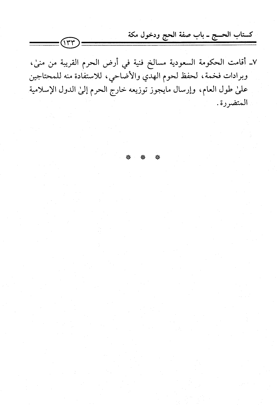 7 - أقامت الحكومة السعودية مسالخ فنية في أرض الحرم القريبة من منى، وبرادات فخمة، لحفظ لحوم الهدي والأضاحي، للاستفادة منه للمحتاجين على طول العام، وإرسال ما يجوز توزيعه خارج الحرم إلى الدول الإسلامية المتضررة.