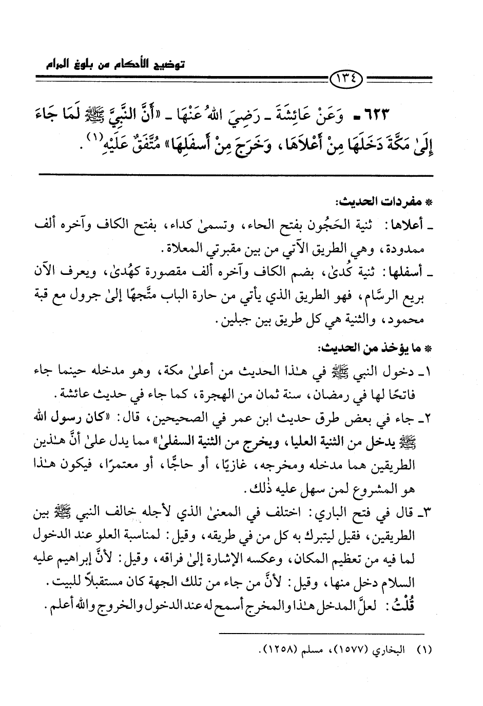 623 - وَعَنْ عَائِشَةَ -رَضِيَ اللهُ عَنْهَا- "أَنَّ النَّبِيَّ -صلى الله عليه وسلم- لَمَا جَاءَ إلَى مَكَّةَ دَخَلَهَا مِنْ أعْلاَهَا، وَخَرَجَ مِنْ أسفَلِهَا" مُتَّفَقٌ عَلَيْهِ (¬1).