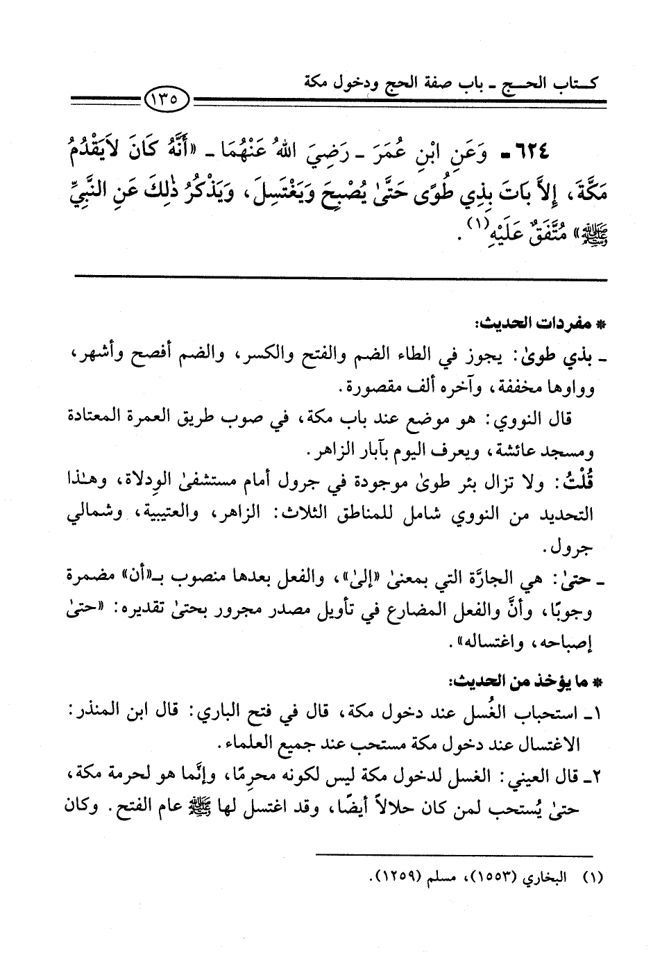 624 - وَعَنِ ابْنِ عُمَرَ -رَضِيَ اللهُ عَنْهُمَا- "أَنَّهُ كَانَ لاَ يَقْدُمُ مَكَّةَ، إلاَّ باتَ بذِي طُوًى حَتَّى يُصْبحَ وَيَغْتَسِلَ، وَيَذْكُرُ ذلِكَ عَنِ النَّبِيِّ -صلى الله عليه وسلم-" مُتَّفَقٌ عَلَيْهِ (¬1).