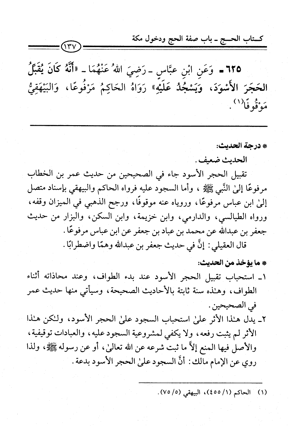 625 - وَعَنِ ابْنِ عبَّاسٍ -رَضِيَ اللهُ عَنْهُمَا- "أنَّهُ كَانَ يُقَبِّلُ الحَجَرَ الأَسْوَدَ، وَيَسْجُدُ عَلَيْهِ" رَوَاهُ الحَاكِمُ مَرْفُوعًا، وَالبَيْهَقِيُّ مَوْقُوفًا (¬1).